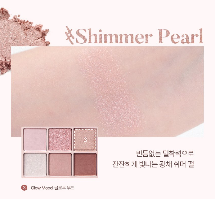 쉬머 펄은 빈틈없는 밀착력으로 잔잔하게 빛나는 광채를 표현할 수 있어요! 글로우 무드 컬러가 쉬머 펄 타입이에요.