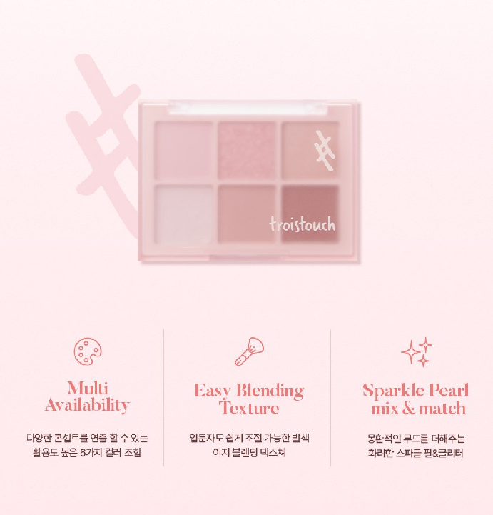 다양한 콘셉트를 연출할 수 있는 활용도 높은 6가지 컬러 조합, 입문자도 쉽게 조절 가능한 발색 이지 블렌딩 텍스쳐, 몽환적인 무드를 더해주는 화려한 스파클 펄&글리터가 특징이에요!