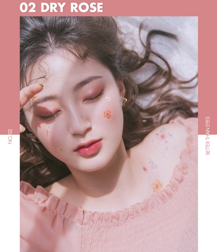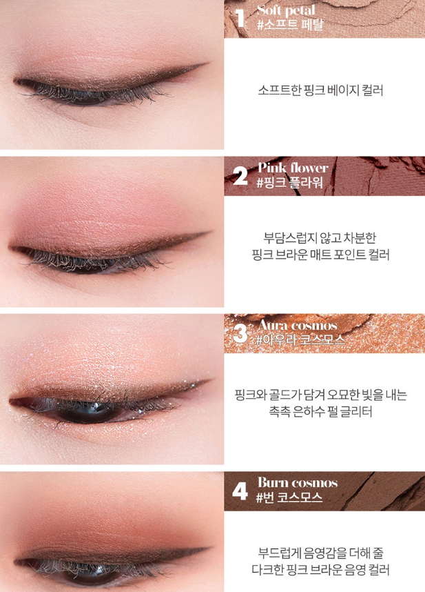 곱디 고운 매트 제형이 눈가를 뽀송하게 정리해줘 크리즈 현상 없이 유지해주며 촤르르 펼쳐지는 촉촉한 오팔 펄 글리터로 눈가에 텁텁함 없이 투명하게 올라가 영롱 메이크업을 완성해줘요. 또 말린 꽃에서 찾은 부드러운 컬러로 눈가를 물들여주는 섀도우랍니다.