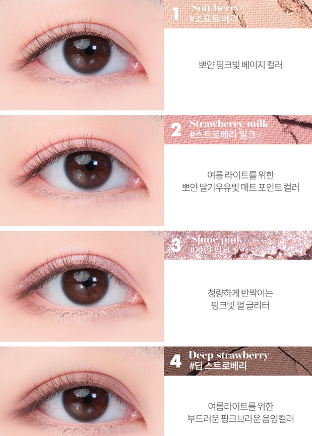 뽀얀 핑크빛 베이스 소프트 베리, 여쿨라이트를 위한 뽀얀 딸기우윳빛 매트 포인트 컬러인 스트로베리 밀크, 청량하게 반짝이는 핑크 펄 글리터인 샤인 핑크, 여쿨라이트를 위한 부드러운 핑크브라운 음영컬러인 딥 스트로베리로 구성되었어요!