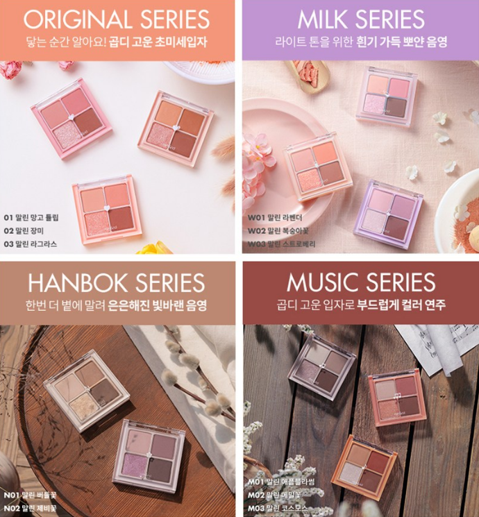 오리지널 시리즈, 밀크 시리즈, 한복 시리즈, 뮤직 시리즈 총 4가지 시리즈로 출시되었어요. 피부톤에 맞게, 취향에 맞게 선택할 수 있어요!