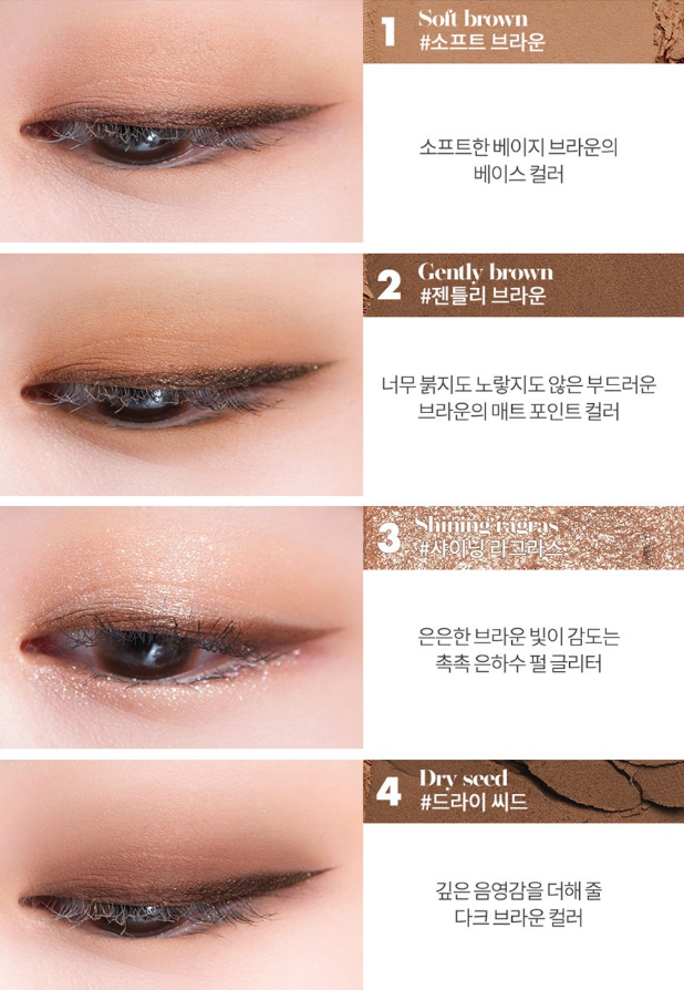 소프트한 베이지 브라운의 베이스 컬러인 소프트 브라운, 너무 붉지도 노랗지도 않은 부드러운 매트 포인트 브라운 컬러인 젠틀리 브라운, 은은한 브라운 빛이 감도는 촉촉 은하수 펄 글리터 샤이닝 라그라스, 깊은 음역감을 더할 다크 브라운 컬러인 드라이 씨드로 구성되었어요.