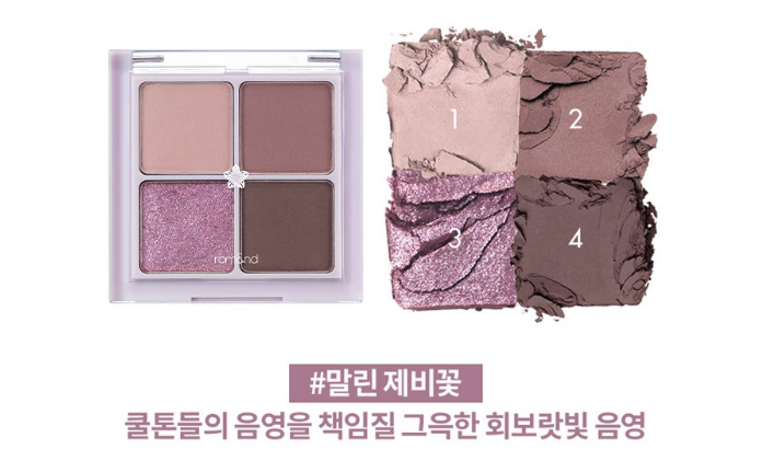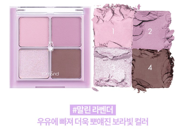 뽀얀 보랏빛 베이지 컬러인 소프트 라벤더, 여쿨라이트를 위한 뽀얀 보랏빛 매트 포인트 컬러인 라벤더 밀크, 유니콘처럼 신비로운 빛을 내는 촉촉 은하수 펄 글리터인 트윙클 퍼플, 라이트톤을 위한 탁함 없는 부드러운 퍼플브라운으로 구성되어 있어요.