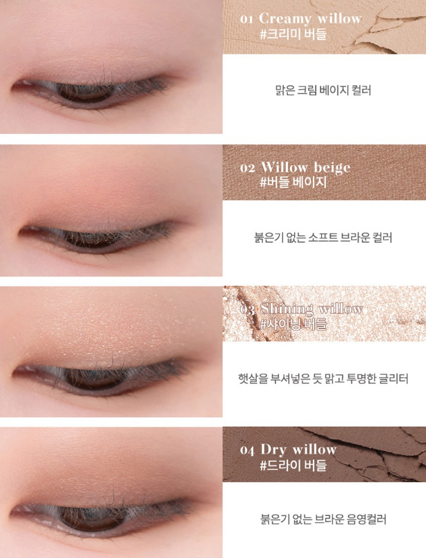 맑은 크림 베이지 컬러인 크리미 버들, 붉은기 없는 소프트 브라운 컬러 버들 베이지, 햇살을 부셔넣은 듯 맑고 투명한 글리터 샤이닝 버들, 붉은기 없는 브라운 음영컬러 드라이 버들로 이루어져있어요.