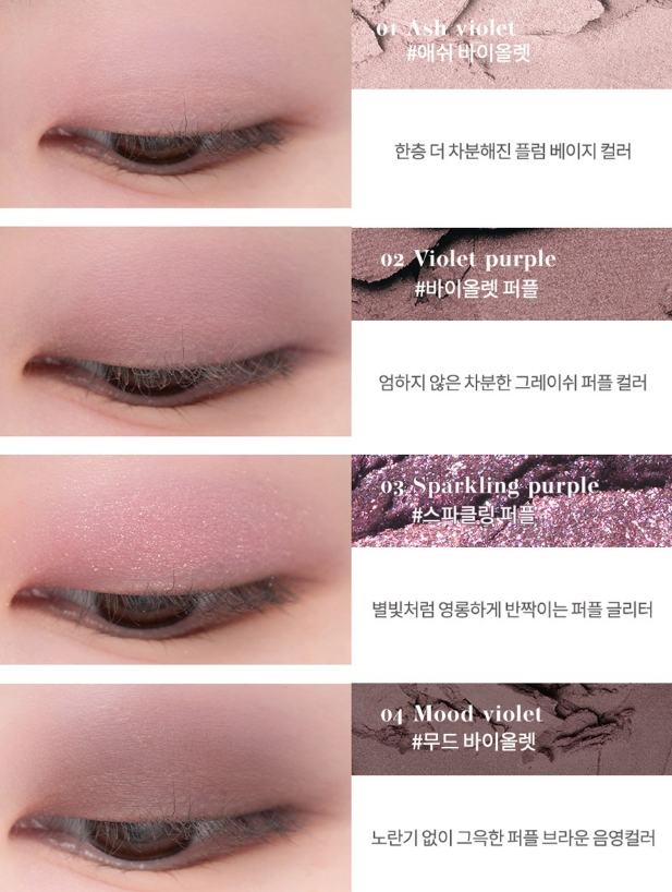 한층 더 차분해진 플럼 베이지 컬러 애쉬 바이올렛, 엄하지 않은 차분한 그레이쉬 퍼플 컬러 바이올렛 퍼플, 별빛처럼 영롱하게 반짝이는 퍼플 글리터 스파클링 퍼플, 노란기 없이 그윽한 퍼플 브라운 음영컬러 무드 바이올렛으로 구성되어 있어요.