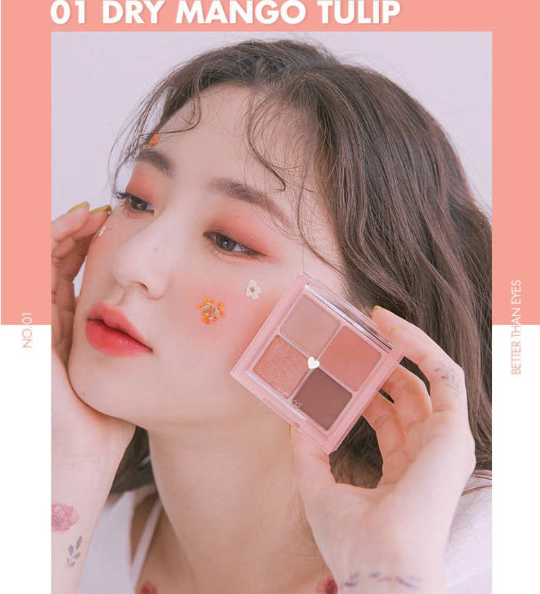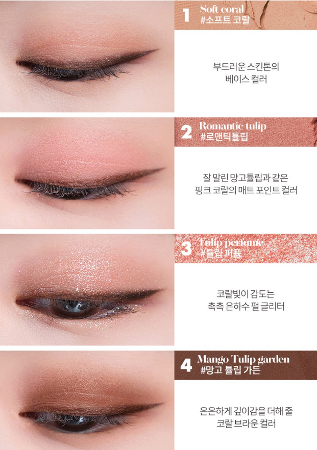 부드러운 스킨톤의 베이스 컬러인 소프트 코랄, 잘 말린 망고튤립과 같은 핑크 코랄의 매트 포인트 컬러인 로맨틱튤립, 코랄빛이 감도는 촉촉 은하수 펄 글리터인 튤립 퍼퓸, 은은하게 깊이감을 더해 줄 코랄 브라운 컬러인 망고 튤립 가든으로 구성되었어요.
