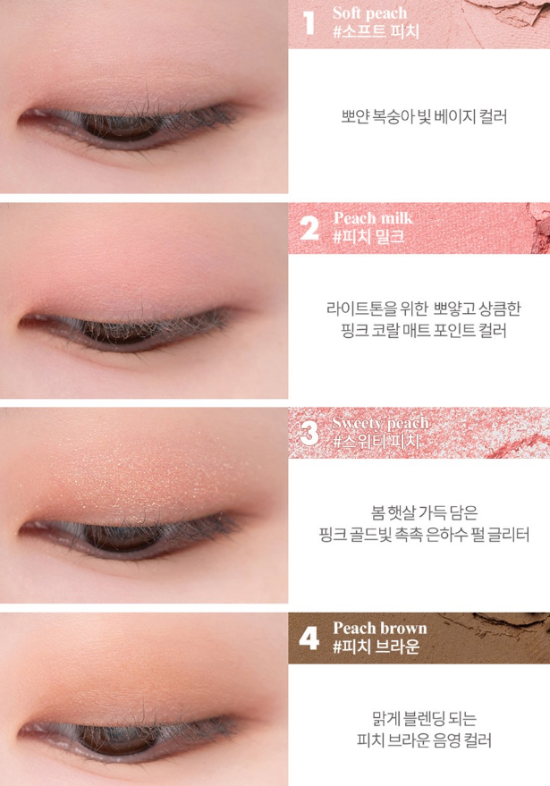 뽀얀 복숭아 빛 베이지 컬러의 소프트 피치, 라이트톤을 위한 뽀얗고 상큼한 핑크 코랄 매트 포인트 컬러인 피치 밀크, 봄 햇살 가득 담은 핑크 골드빛 촉촉 은하수 펄 글리터인 스위티 피치, 맑게 블렌딩 되는 피치 브라운 음영 컬러인 피치 브라운으로 구성되었어요.