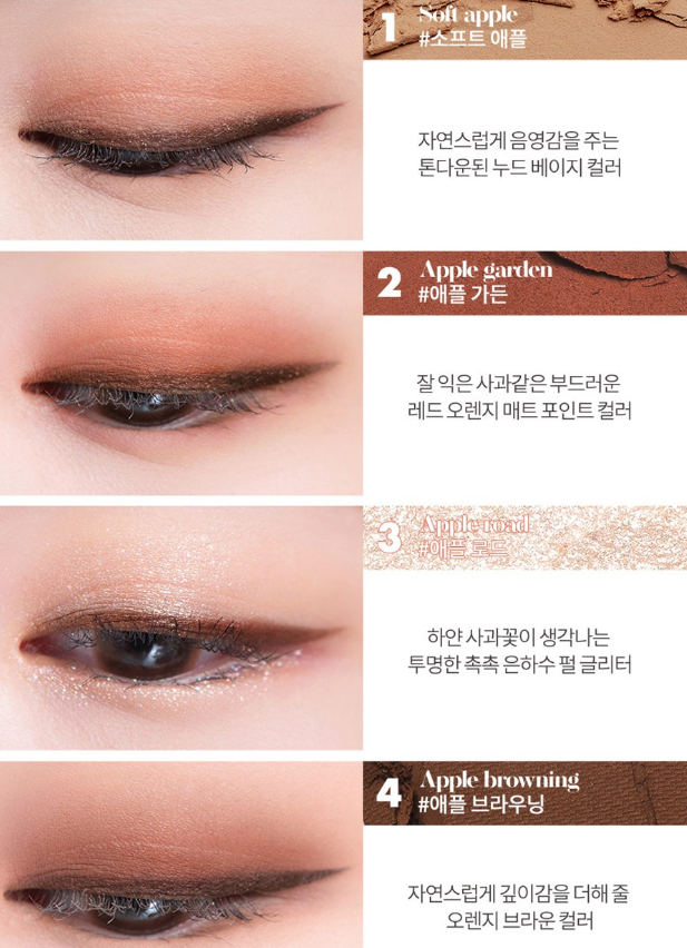 자연스럽게 음영감을 주는 톤다운된 누드 베이지 컬러 소프트 애플, 잘 익은 사과같은 부드러운 레드 오렌지 매트 포인트 컬러 애플 가든, 하얀 사과꽃이 생각나는 투명한 촉촉 은하수 펄 글리터 애플 로드, 자연스럽게 깊이감을 더해 줄 오렌지 브라운 컬러 애플 브라우닝으로 구성되어 있어요.