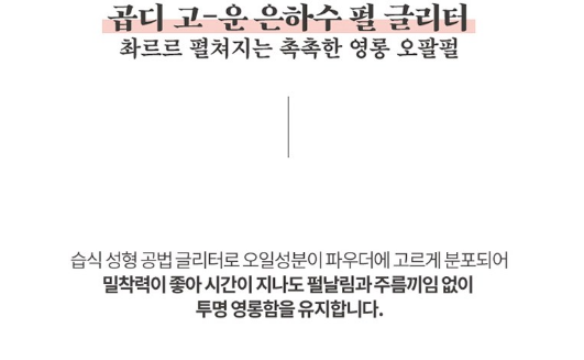 촤르르 펼쳐지는 촉촉한 영롱 오팔펄이 특징인데, 습식 성형 공법 글리터로 오일성분이 파우더에 고르게 분포되어 밀착력이 좋아 시간이 지나도 펄날림과 주름끼임 없이 투명 영롱함을 유지해줘요.