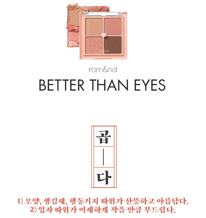그래서 오늘은 데일리로 쓸 수 있는 아이섀도우 추천 한 가지를 해볼 건데요. 바로 롬앤 베러 댄 아이즈 아이팔레트예요. 롬앤 아이섀도우도 색상이 예쁘기로 유명하니, 지금부터 한 번 확인해보세요!