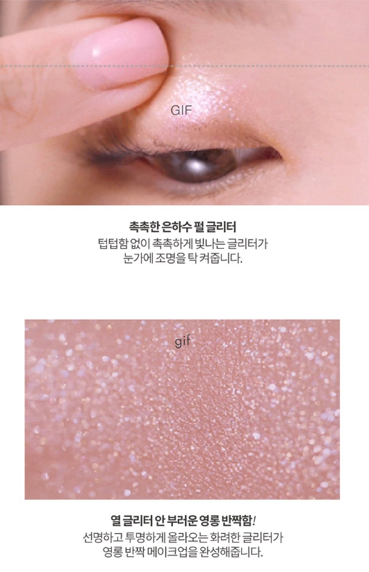 텁텁함 없이 촉촉하게 빛나는 글리터가 눈가에 조명을 탁 켜주며, 선명하고 투명하게 올라오는 화려한 글리터가 영롱 반짝 메이크업을 완성해줘요.