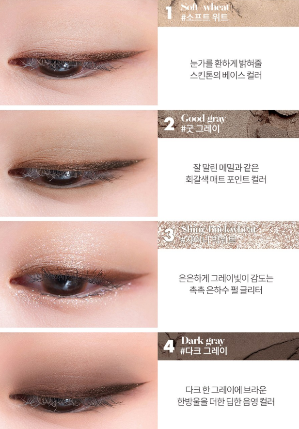 눈가를 환하게 밝혀줄 스킨톤의 베이스 컬러 소프트 위트, 잘 말린 메밀과 같은 회갈색 매트 포인트 컬러 굿 그레이, 은은하게 그레이빛이 감도는 촉촉 은하수 펄 글리터 샤이니 벅위트, 다크한 그레이에 브라운 한방울을 더한 딥한 음영 컬러 다크 그레이