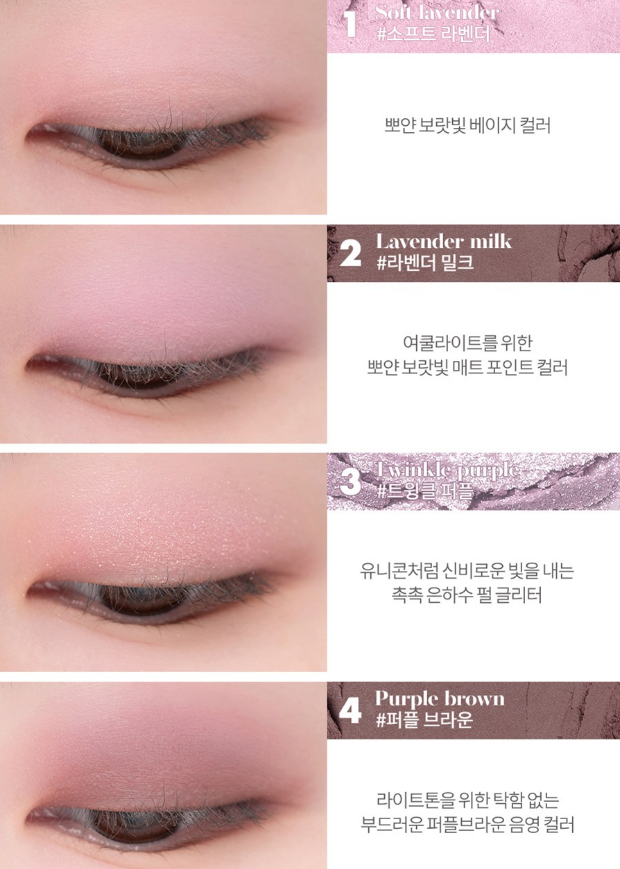 뽀얀 보랏빛 베이지 컬러인 소프트 라벤더, 여쿨라이트를 위한 뽀얀 보랏빛 매트 포인트 컬러인 라벤더 밀크, 유니콘처럼 신비로운 빛을 내는 촉촉 은하수 펄 글리터인 트윙클 퍼플, 라이트톤을 위한 탁함 없는 부드러운 퍼플브라운으로 구성되어 있어요.