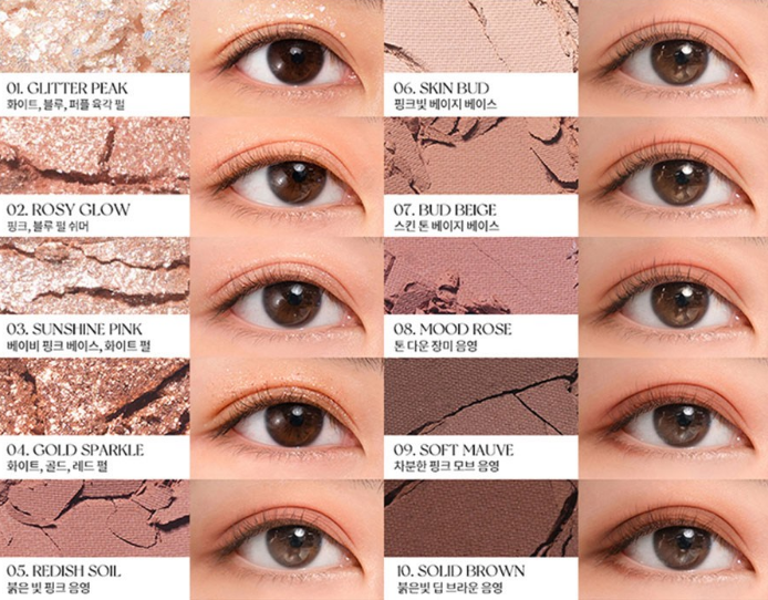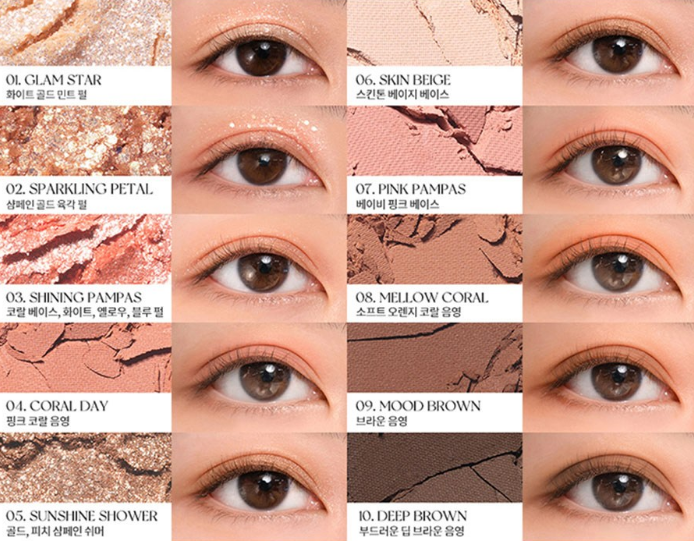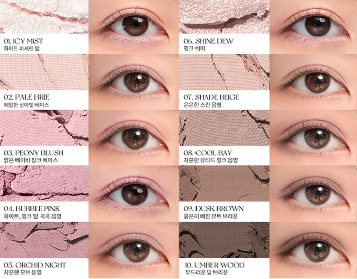 화이트 바세린 펄 아이시 미스트, 페일한 상아빛 베이스 페일 브리, 맑은 베이비 핑크 베이스 피오니 브러쉬, 화이트&핑크 펄 콕콕 음영 버블 핑크, 차분한 모브 올키드 나잇, 핑크 쉬머 샤인 두, 은은한 스킨톤 쉐이드 베이지, 차분한 뮤티드 핑크 쿨 배이, 붉은기 빠진 뮤트 브라운 더스크 브라운, 부드러운 딥 브라운 엄버 우드로 구성되어 있어요.