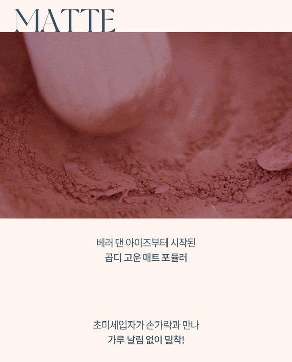 베러 댄 아이즈부터 시작된 곱디 고운 매트 포뮬러예요. 초미세입자가 손가락과 만나 가루 날림 없이 밀착된답니다:)