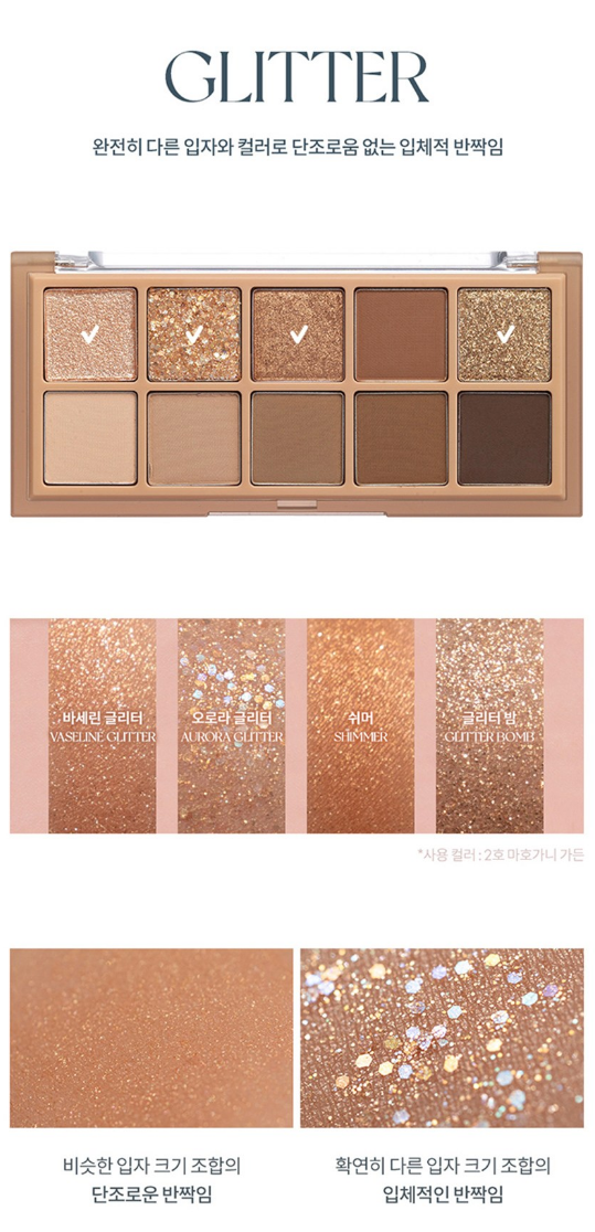 완전히 다른 입자와 컬러로 단조로움 없는 입체적 반짝임이 특징인 글리터 타입 섀도우들이에요.