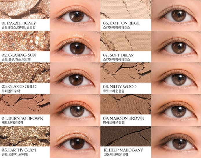 골드 베이스&화이트&골드 펄 데이즐 허니, 골드&블루&퍼플&육각 펄의 글레링 선, 쿠퍼 골드 쉬머 글레즈드 골드, 레드 브라운 음영 버닝 브라운, 골드&오렌지&실버 펄 얼씨 글램, 스킨톤 베이지 베이스 코튼 베이지와 소프트 드림, 뮤트 브라운 음영 마일디 우드, 밤색 브라운 음영 마론 브라운, 고동색 브라운 음영 딥 마호가니 컬러로 구성되어 있어요.