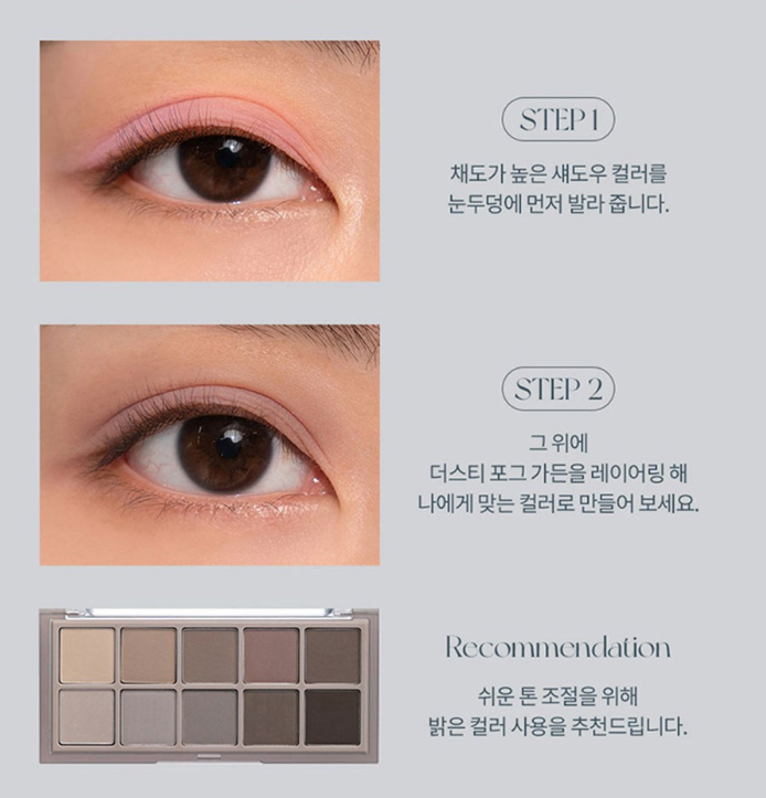 채도 높아 못 쓰는 섀도우 컬러에 더스티 포그 가든을 섞어 사용해보세요! 채도가 높은 섀도우 컬러를 먼저 바른 후 더스티 포그 가든을 레이어링 해 나에게 맞는 컬러로 만들 수 있어요. 이때, 쉬운 톤 조절을 위해 밝은 컬러 사용을 추천드려요!
