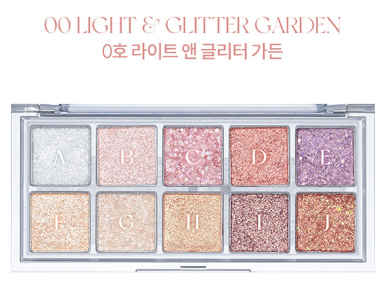 10가지 글리터 컬러로만 구성된 라이트&글리터 가든 섀도우예요.