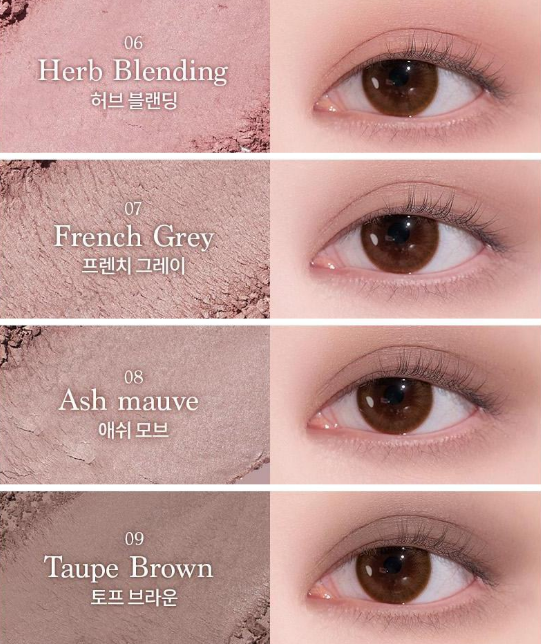 컬러는 01 쉬폰 그레이, 02 텐더 쟈스민, 03 얼그레이 04 타로 파우더 05 쿨 웨하스 06 허브 블랜딩 07 프렌치 그레이 08 애쉬 모브 09 토프 브라운 총 9가지로 구성되어 있어요.