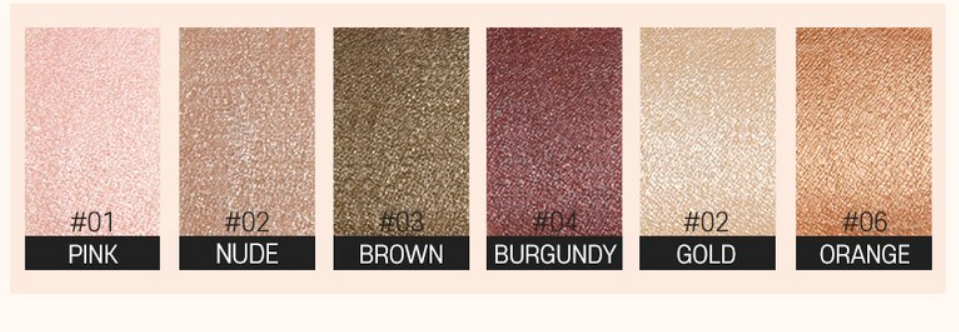 핑크, 누드, 브라운, 버건디, 골드, 오렌지 6가지 색상으로 이루어져있어요!