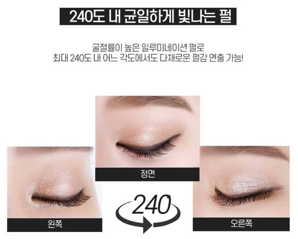 굴절률이 높은 일루미네이션 펄로 최대 240도 내 어느 각도에서도 다채로운 펄감 연출이 가능해요.