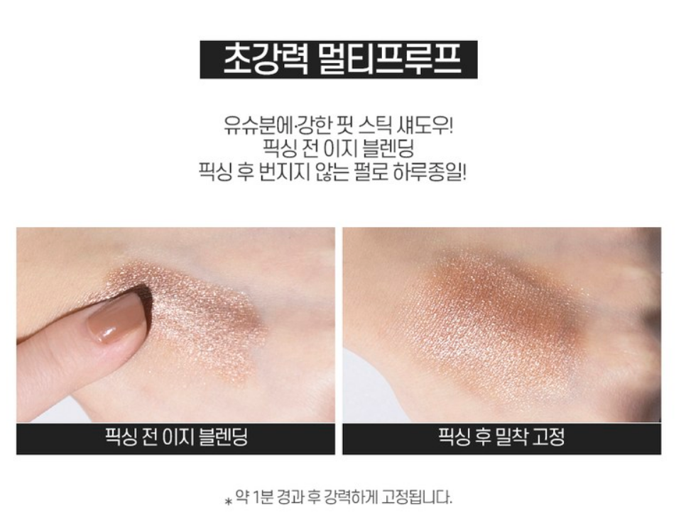 유수분에 강한 핏 스틱 섀도우예요. 픽싱 전에는 이지 블렌딩, 픽싱 후에는 번지지 않는 펄로 하루종일 가는 지속력이 특징이에요!