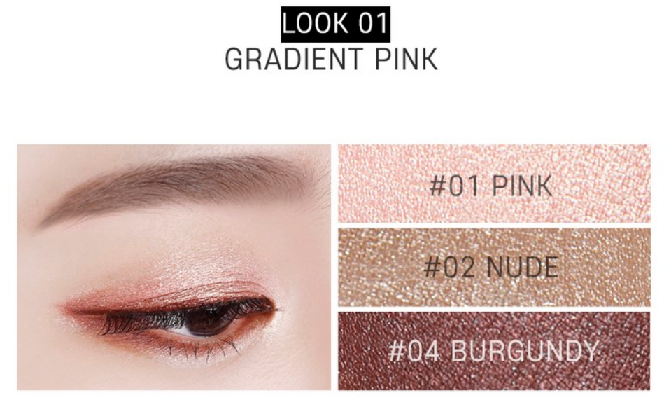 1호 핑크, 2호 누드, 4호 버건디 컬러로 그래디언트 핑크 룩을 연출할 수 있어요!