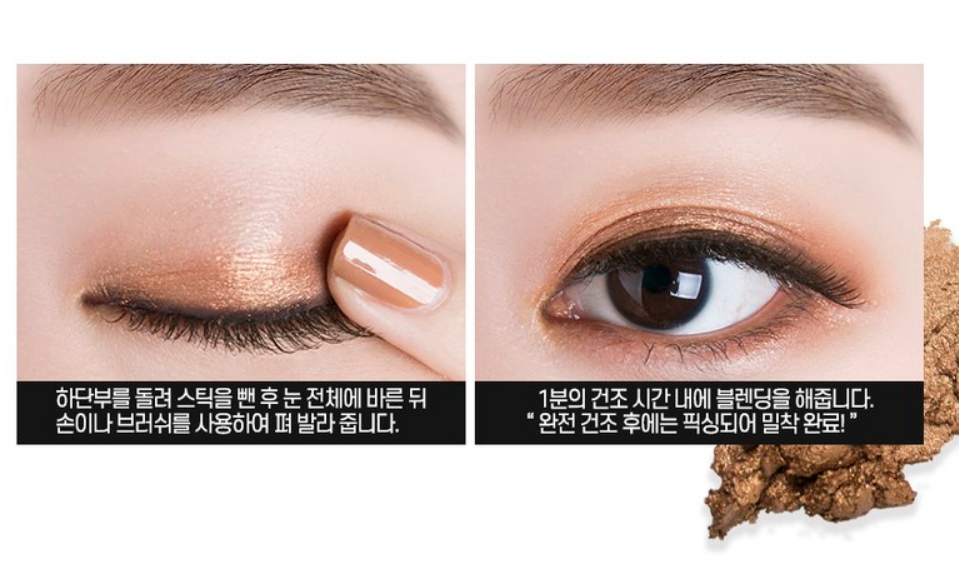 하단부를 돌려 스틱을 뺀 후 눈 전체에 바른 뒤 손이나 브러쉬를 사용하여 펴 발라 줘요. 1분의 건조 시간 내에 블렌딩을 해주면된답니다!
