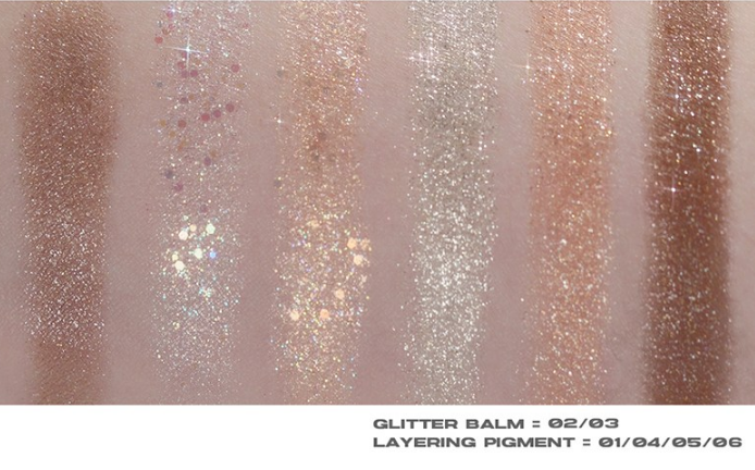 오 : 스터너를 피부에 발색한 모습이에요:) 02호, 03호가 글리터 밤, 나머지 호수가 레이어링 피그먼트랍니다!