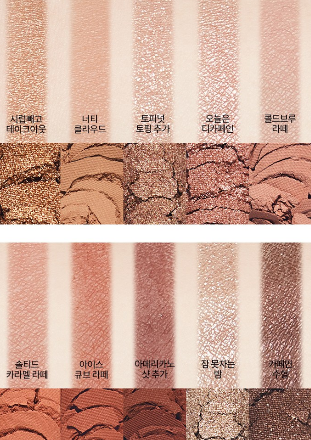 딥한 커피 컬러의 10색 아이섀도우 팔레트 제품인데요. 깊이있는 눈매를 연출해주는 핑크~레드 브라운의 커피톤 컬러 구성으로 우아한 분위기의 포인트 메이크업에 적합한 컬러 구성이에요. 또 부드럽고 밀착력이 우수한 베이스로 뭉침과 가루날림 없이 오랜 시간 선명한 발색과 펄감이 유지돼요!