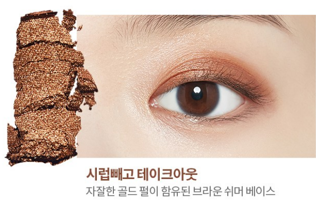 에뛰드하면 시.빼.테 들어보셨을 거예요. 자잘한 골드 펄이 함유된 브라운 쉬머 베이스로 유명한만큼 정말 예쁘고 인기많은 컬러랍니다!