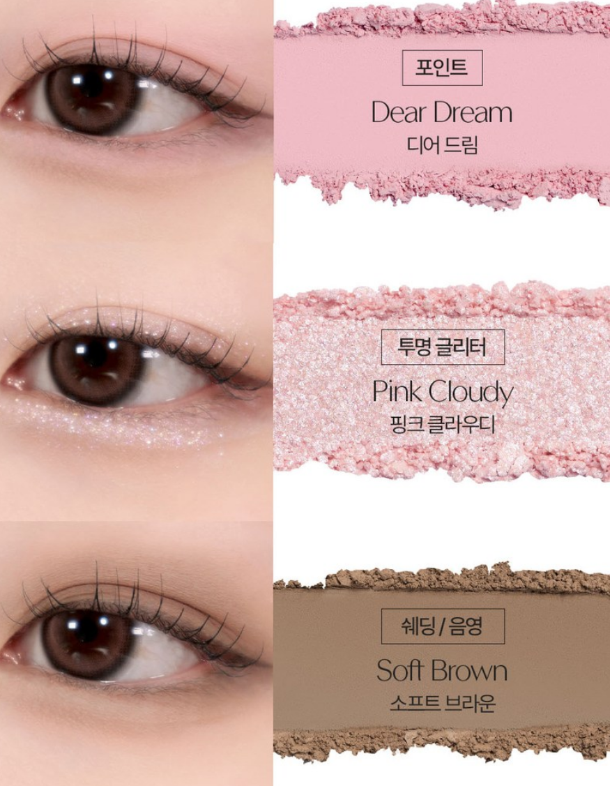치크 컬러 센슈얼 로지, 프라이머 베이스 누디 핑크, 포인트 컬러 디어 드림, 투명 글리터 핑크 클라우디, 쉐딩/음영 컬러 소프트 브라운으로 구성되어 있답니다!