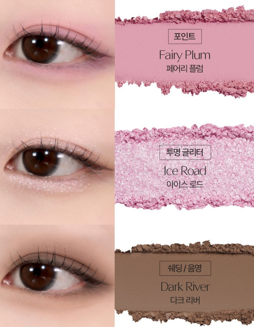 치크 컬러 홀리 퍼플, 프라이머 베이스 베일 스킨, 포인트 컬러 페어리 플럼, 투명 글리터 아이스 로드, 쉐딩/음영 다크 리버 컬러로 구성되어 있어요! 보라빛의 느낌이 예쁜 팔레트예요:)