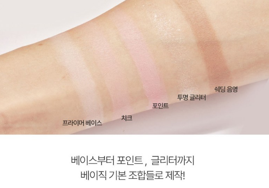 치크 컬러 센슈얼 로지, 프라이머 베이스 누디 핑크, 포인트 컬러 디어 드림, 투명 글리터 핑크 클라우디, 쉐딩/음영 컬러 소프트 브라운으로 구성되어 있답니다!