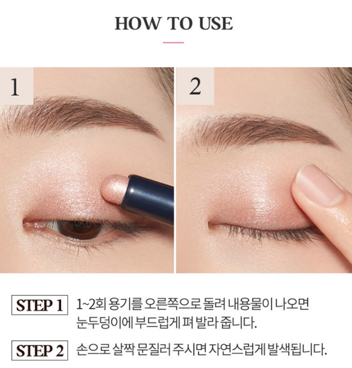 1~2회 용기를 오른쪽으로 돌려 내용물이 나오면 눈두덩이에 부드럽게 펴 발라줘요. 이때 손으로 살짝 문질러 주시면 자연스럽게 발색된답니다!