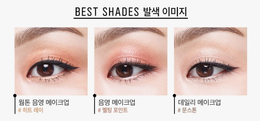 웜톤 음영 메이크업 가능한 메탈 "히트 레이", 데일리 음영 메이크업 가능한 메탈 "멜팅 포인트", 데일리 베이직 메이크업 가능한 스파클 "문스톤" 컬러가 있어요!