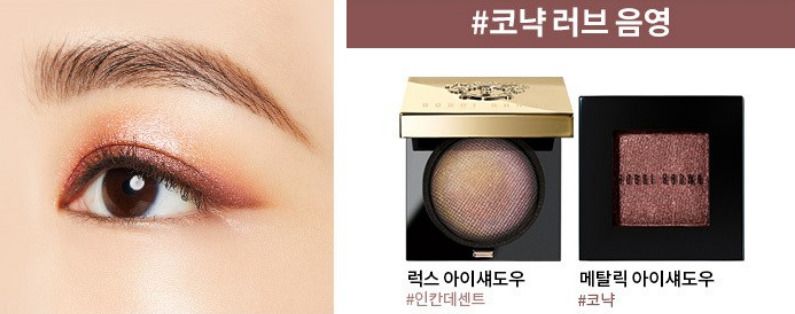 럭스 아이섀도우 인칸데센트와 메탈릭 아이섀도우 코냑을 함께 발색하면 코냑 러브 음영 메이크업 연출할 수 있어요!