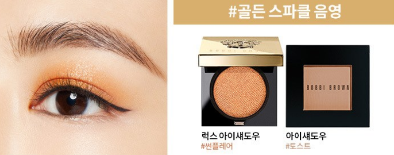 럭스 아이섀도우 썬플레어와 기본 바비브라운 아이섀도우인 토스트 컬러와 함께 발색하면 골든 스파클 음영을 연출할 수 있어요.