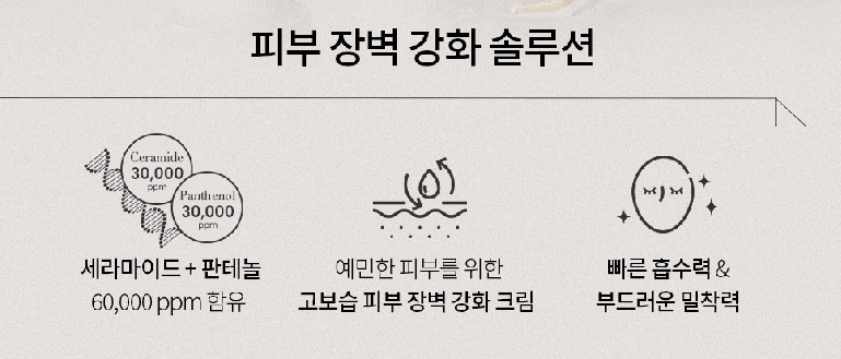 세라마이드+판테놀이 60,000ppm이 함유되어 있는 예민한 피부를 위한 고보습 피부 장벽 강화 크림이에요. 빠른 흡수력과 부드러운 밀착력이 특징이랍니다!