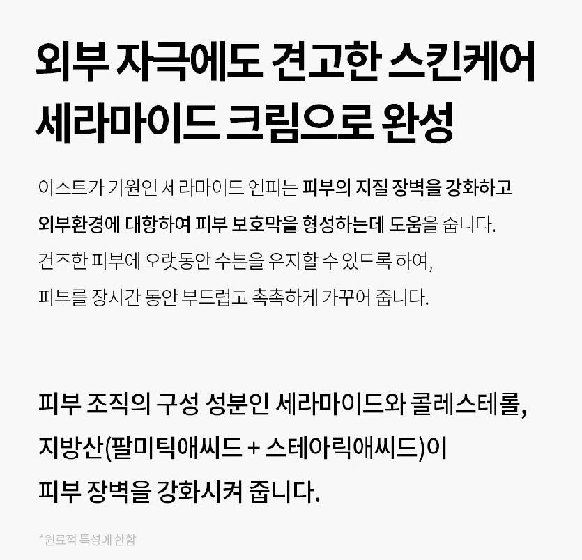 이스트가 기원인 세라마이드 엔피는 피부의 지질 장벽을 강화하고 외부환경에 대항하여 피부 보호막을 형성하는데 도움을 주어요. 건조한 피부에 오랫동안 수분을 유지할 수 있도록 하여 피부를 장시간 부드럽고 촉촉하게 가꾸어준답니다. 또 피부 조직의 구성 성분인 세라마이드와 콜레스테롤, 지방산(팔미틱애씨드+스테아릭애씨드)이 피부 장벽을 강화시켜줘요.