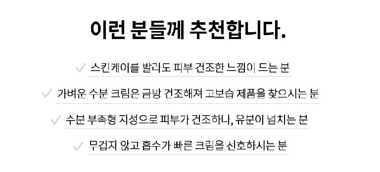 스킨케어를 발라도 건조한 느낌이 드는 분, 고보습 제품 찾으시는 분, 수분 부족형 지성으로 피부가 건조하나 유분이 넘치는 분, 무겁지 않고 흡수 빠른 크림 선호하시는 분께 추천하는 제품이에요:)