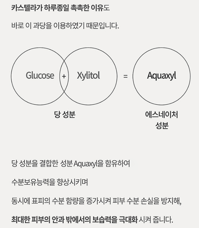 좀 더 쉽게 말하자면 하루종일 촉촉한 카스텔라의 원리라고 보시면되는데요. 당 성분을 결합한 Aquazyl을 함유하여 수분보유능력을 향상시키는 동시에 표피의 수분 함량을 증가시켜 피부 수분 손실을 방지해 최대한 피부의 안과 밖에서 보습력을 극대화 시켜줘요:)