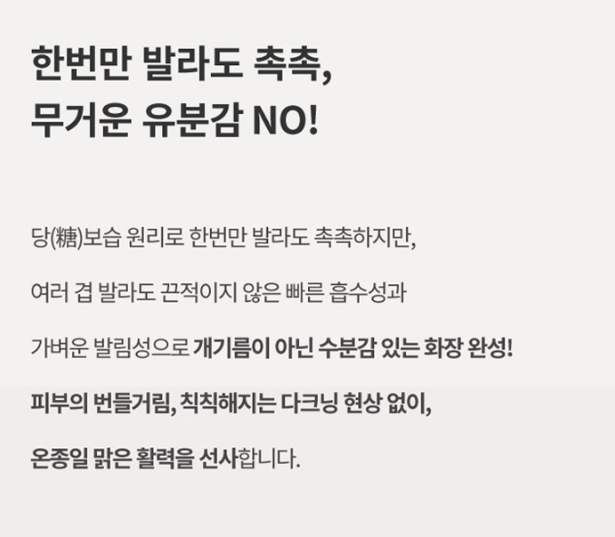 수분감 가득한 쫀쫀한 크림 제형으로, 바르자마자 부드럽게 흡수되어 피부에 밀착돼요.