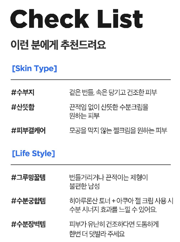 수부지(수분부족지성) 분들, 산뜻함을 원하는 분들, 모공을 막지 않는 젤크림을 원하시는 분, 번들거리거나 끈적이는 제형이 불편한 남성분들께 추천드려요!