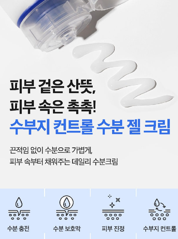 겉은 산뜻하게, 속은 촉촉하게 끈적임 없이 수분으로 가볍게, 피부 속부터 채워주는 데일리 수분크림이에요. 수분 충전, 수분 보호막, 피부 진정, 수부지 컨트롤을 돕는답니다.