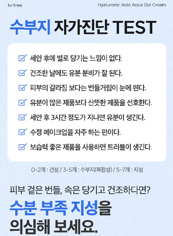위 7가지 항목 중 자신이 겪고 있는 것을 체크해보세요! 만약 0~2개가 해당된다면 건성, 3~5개라면 수부지(복합성/수분부족지성), 5~7개라면 지성으로 예상돼요. 피부 겉은 번들거리면서 속은 당기고 건조하다면 수분 부족 지성을 의심해보세요!