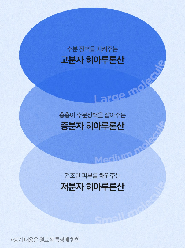 수분 장벽을 지켜주는 고분자 히아루론산, 층층이 수분장벽을 잡아주는 중분자 히아루론산, 건조한 피부를 채워주는 저분자 히아루론산이 함유되었어요:)