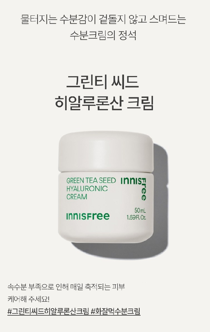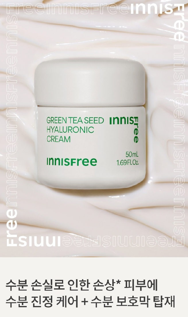 오늘은 촉촉한 수분크림 찾고 계시는 분들께 추천드릴만한 제품을 들고와봤는데요. 바로 이니스프리 그린티 씨드 히알루론산 고수분 크림이에요. 관심 있으신 분들 주목하시고 함께 살펴보아요~!