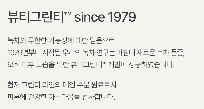 녹차의 무한한 가능성에 대한 믿음으로 1979년부터 시작된 녹차연구는 새로운 녹차 품종, 오직 피부 보습을 위한 뷰티그린티 개발에 성공했다고 해요. 현재 그린티 라인의 메인 수분 원료로서 피부에 건강한 아름다움을 선사해요.